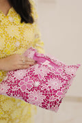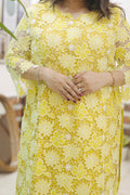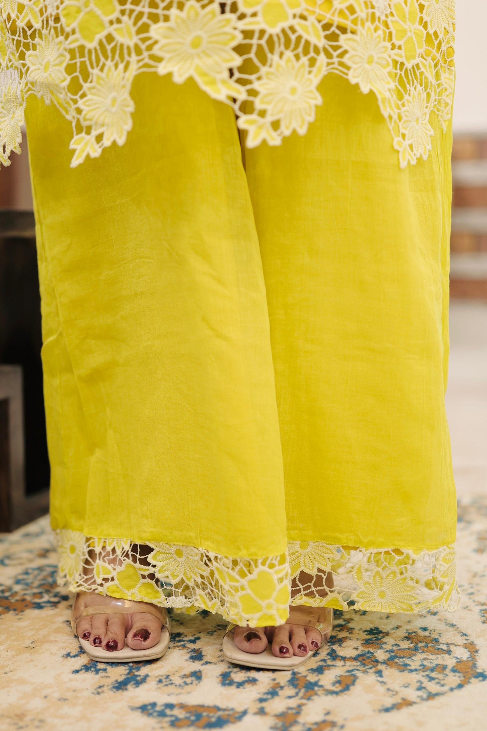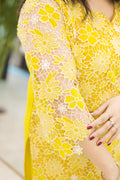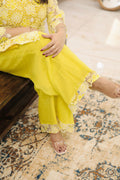 A breezy cotton farshi set in ivory, kissed with yellow floral prints and lace trims. Finished with a striped appliqué neckline and a sheer chiffon dupatta that flows like summer citrus.