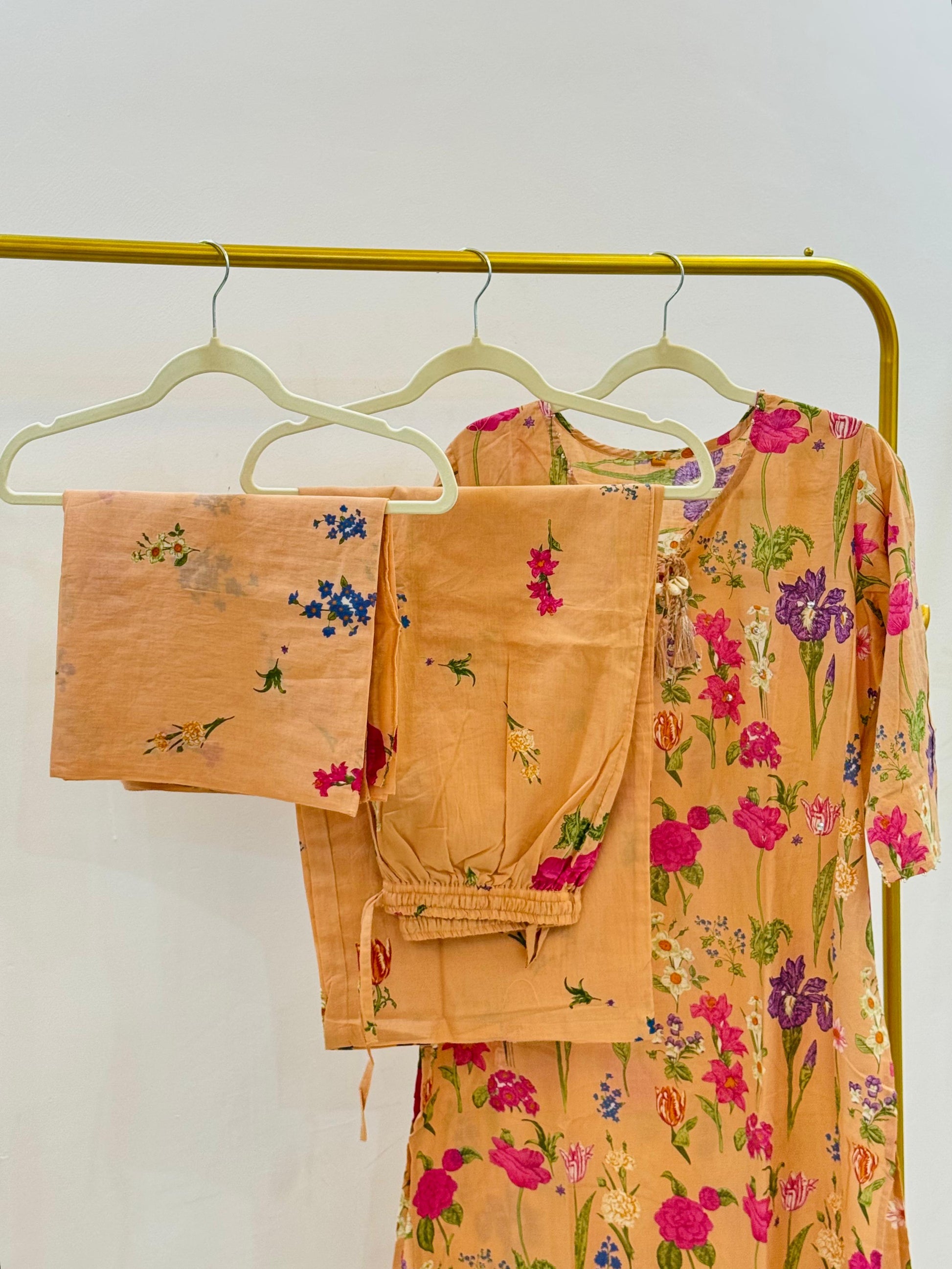 Brewed for bold elegance, the *Espresso Bloom Co-ord* is a chic shirt-style set crafted in soft handloom fabric. Featuring vertical stripes, delicate floral embroidery, and intricate lace detailing, this outfit blends sophistication with charm. Perfect for brunch dates or evening soirees — sip in style, effortlessly.